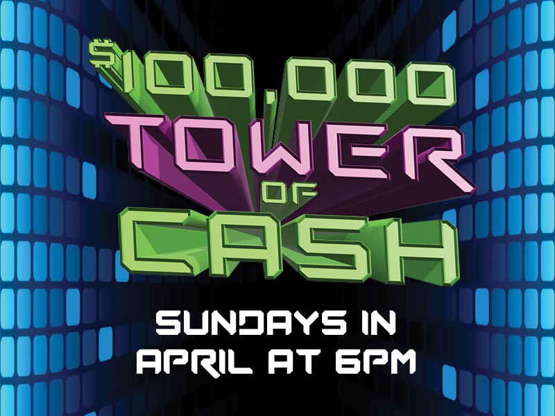 Drawings are Sundays in April at 6pm! Six finalists face the tower each week. All collect CASH or PRIZES! Push your luck, and you could win SIX FIGURES!